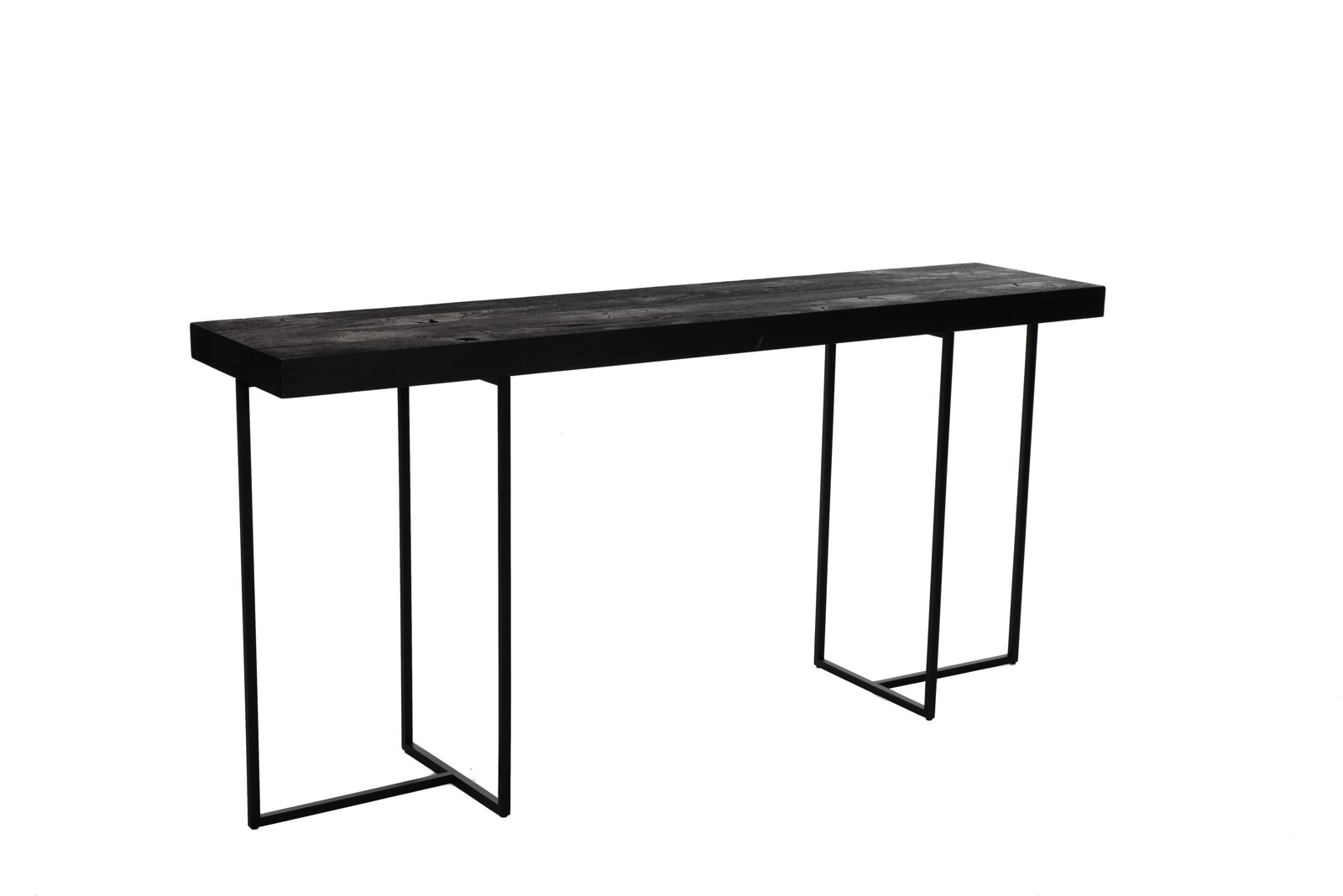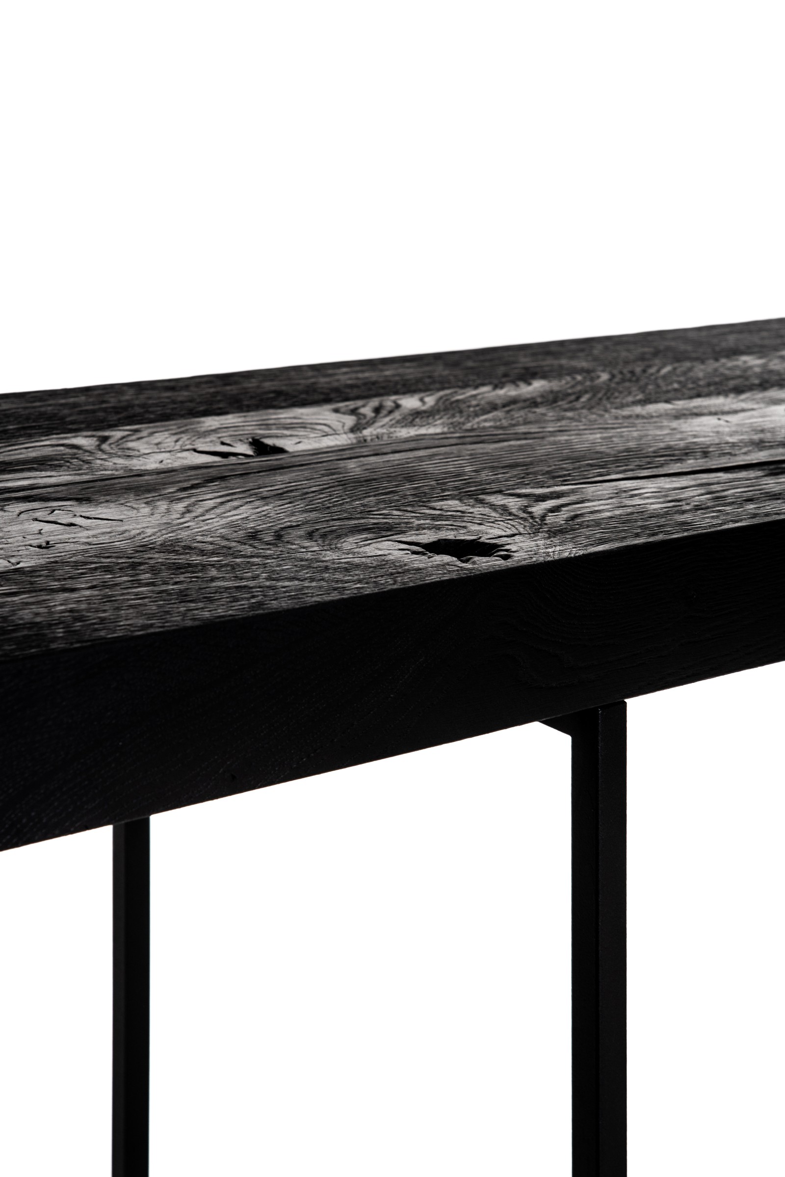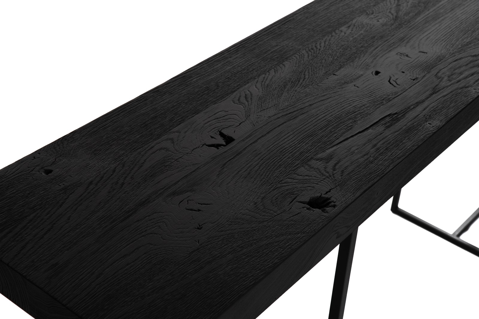 Met een sterke grafische lijn in het metalen onderstel en een massieve eiken blad